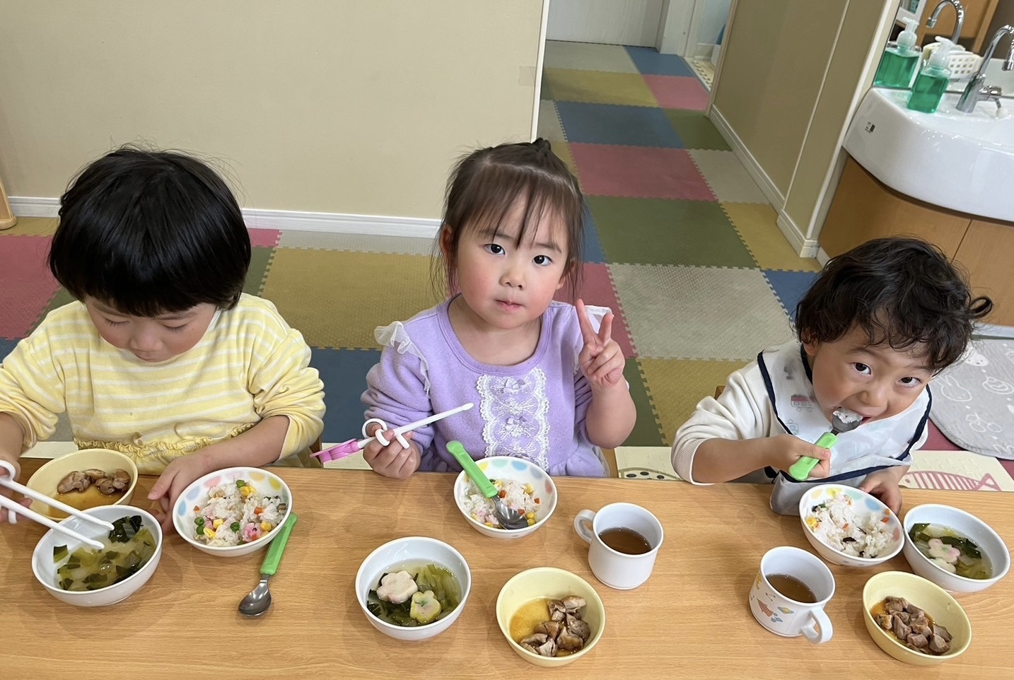 すまし汁のなかには、お花の形のお麩も入っており、「おはなだー!」と喜ぶ子どもたちでした🌼
