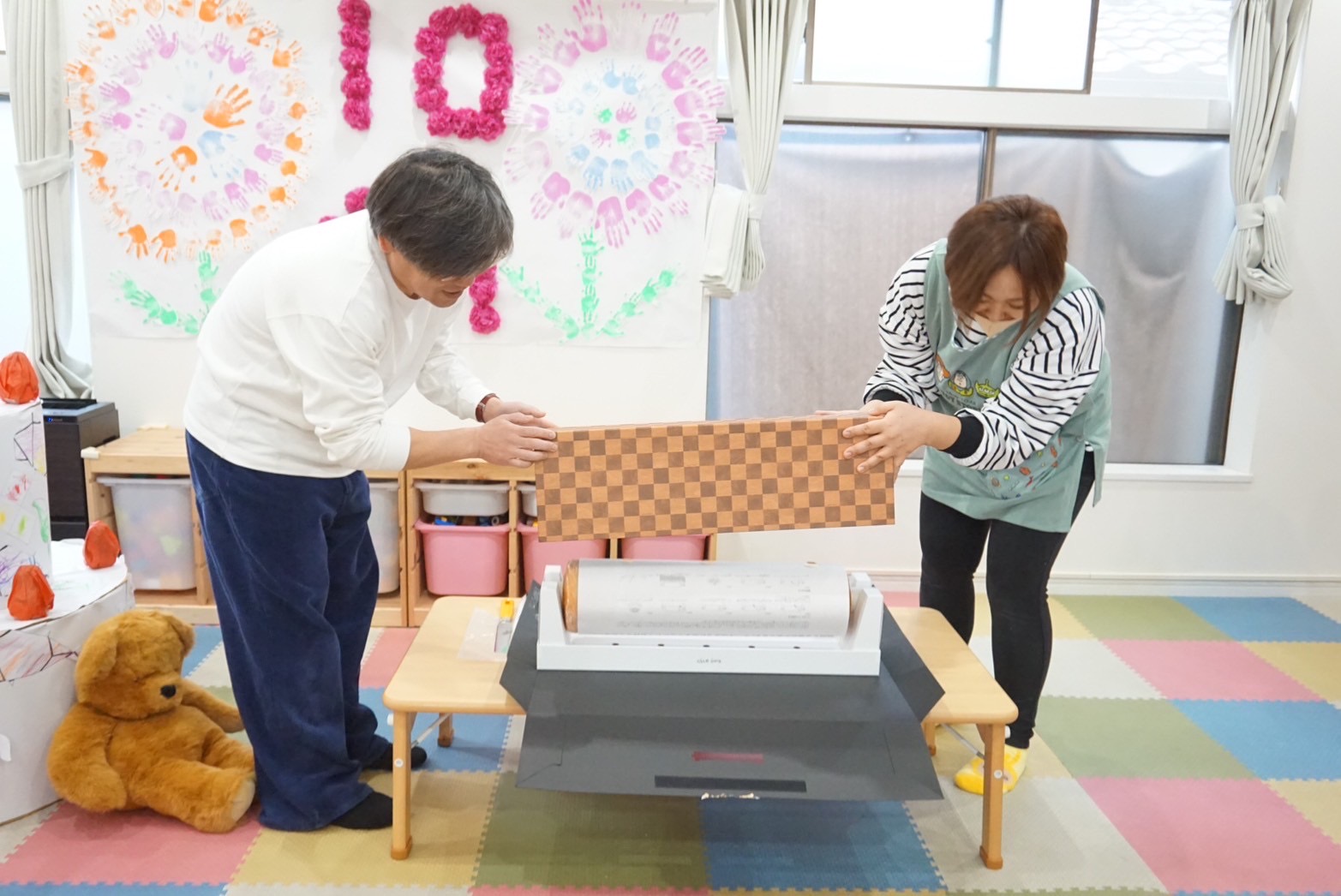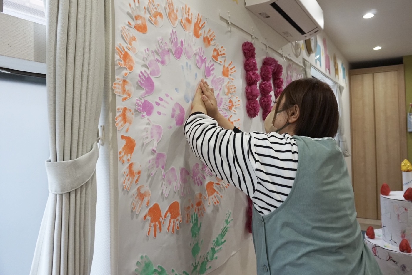 壁面には、子どもたちや保育者たちの手型で作られた大きなお花が飾られました🖐️