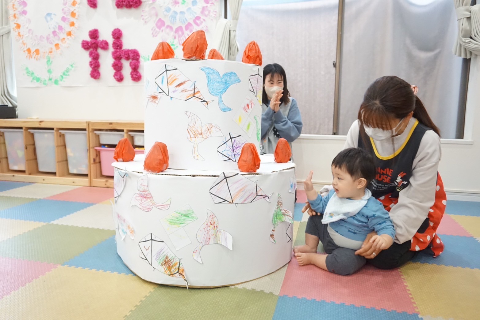 ケーキの飾りは、くじら保育園のマークの塗り絵ををみんなで塗り、作り上げました🐳