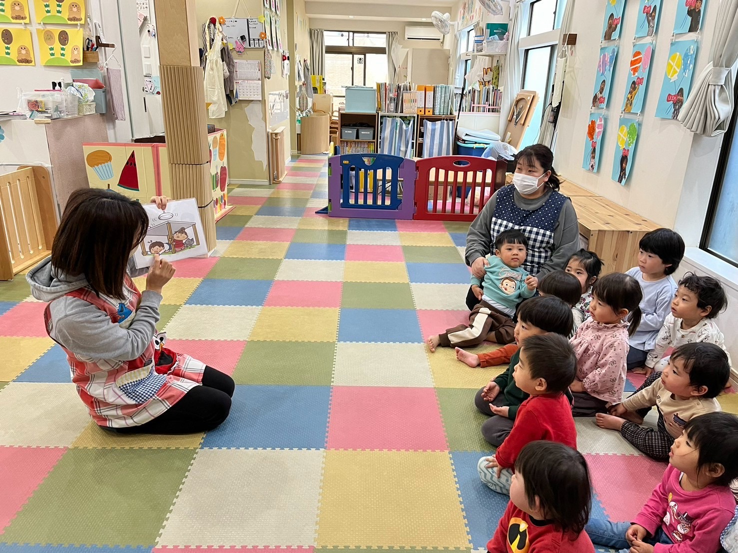 保育園では月に一度、避難訓練(火災・地震•不審者対応を想定)を行なっています。