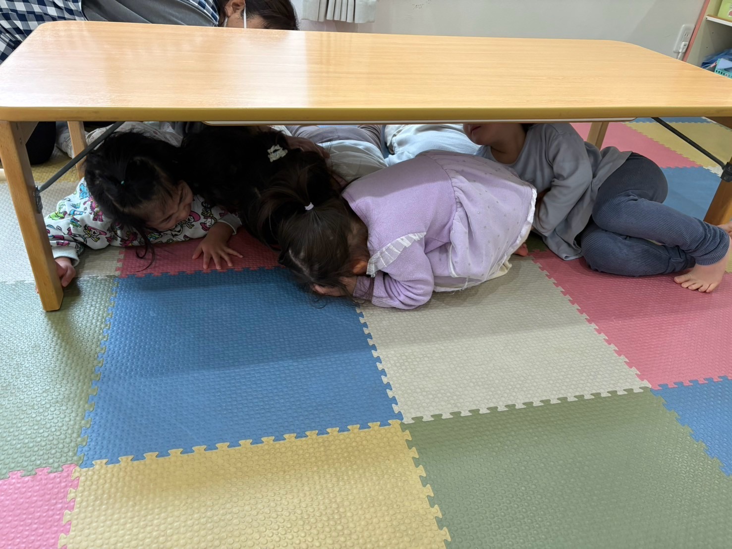 「地震が発生しました!子どもたちの身の安全を守って下さい!」保育者の突然の呼びかけに、驚いた表情の子どもたちでしたが、保育者の誘導で布団を被ったり、机の下に潜ってじっと待つことができました。