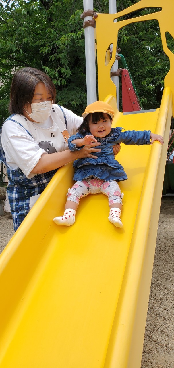 保育者に支えられながら、滑り台を滑ったり…