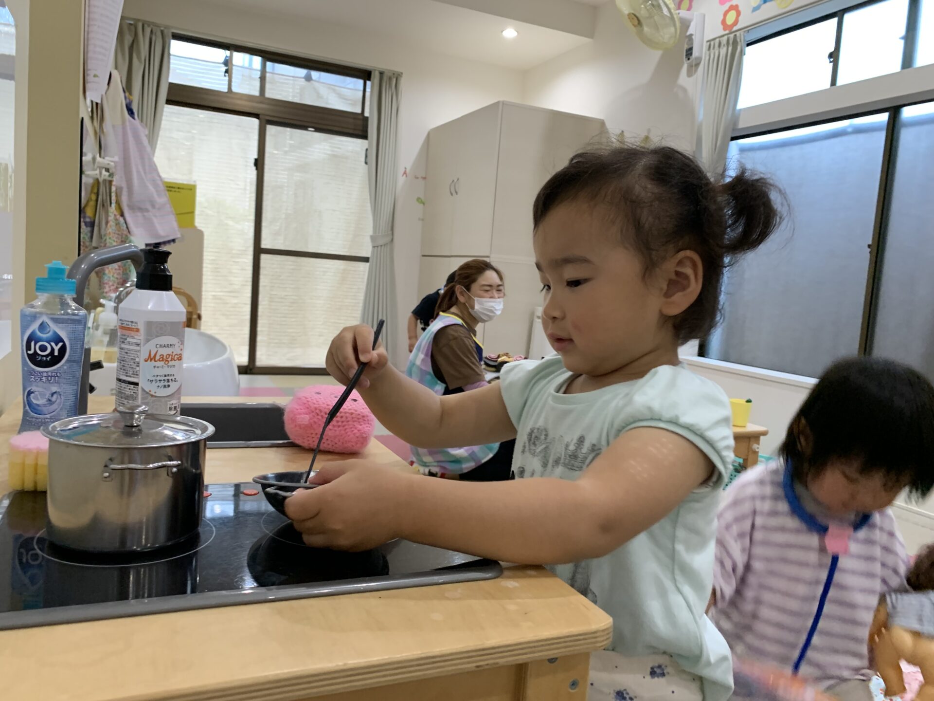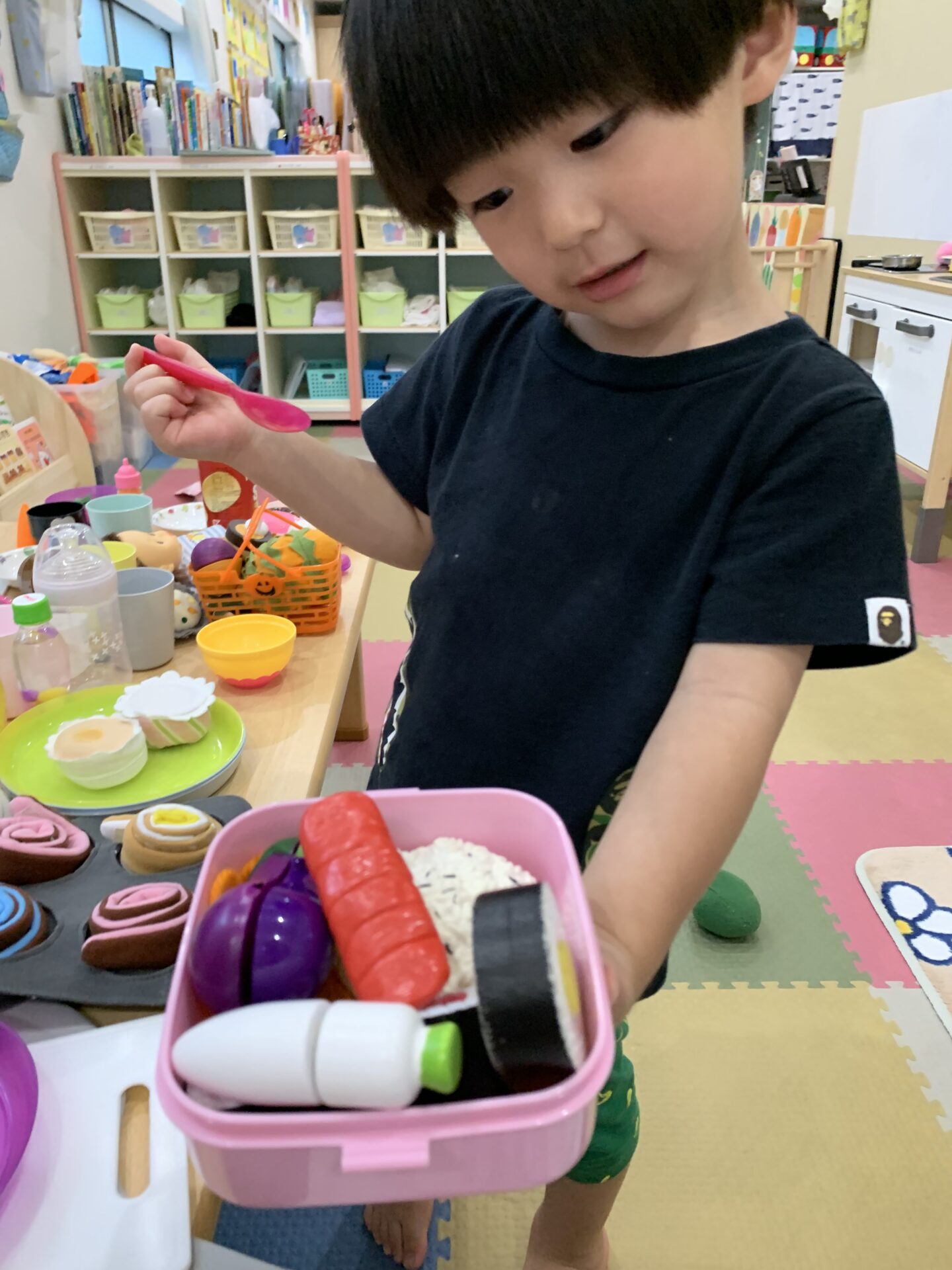 食べ物や調理器具やお人形を使って、一人ひとり遊び方を見つける子どもたち👀✨