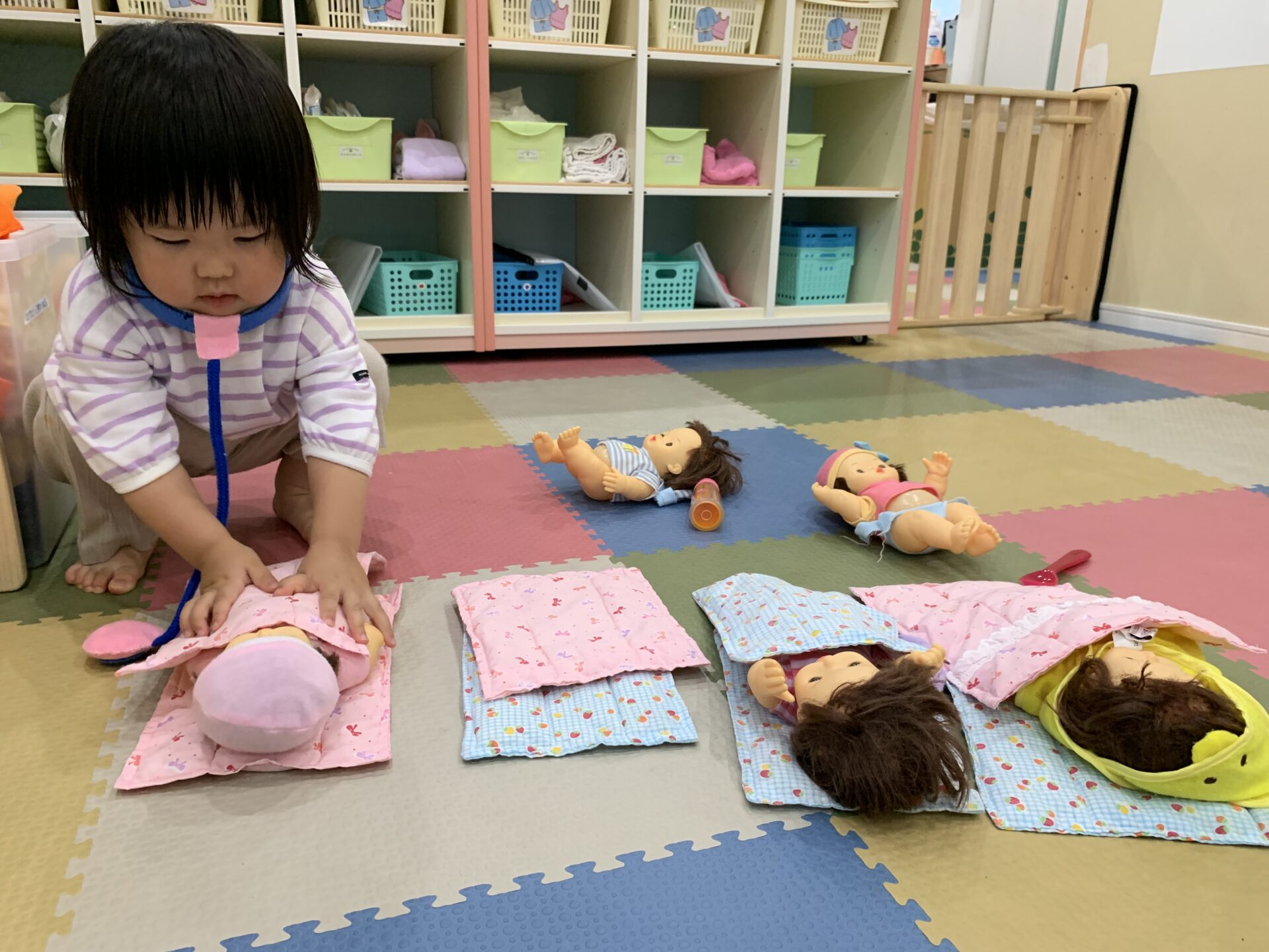 お人形を一人ひとり寝かせながら、お医者さんのような優しい言葉使いで、診察をしていました☺️