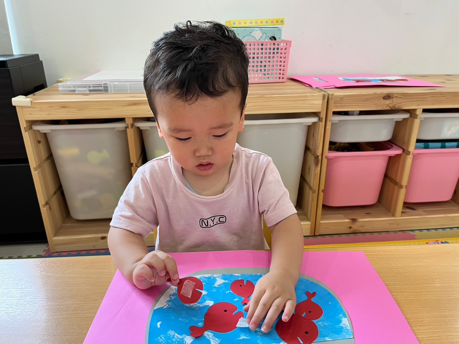 次の日、みんなが絵の具で塗ってくれた金魚鉢に、金魚を貼りました。