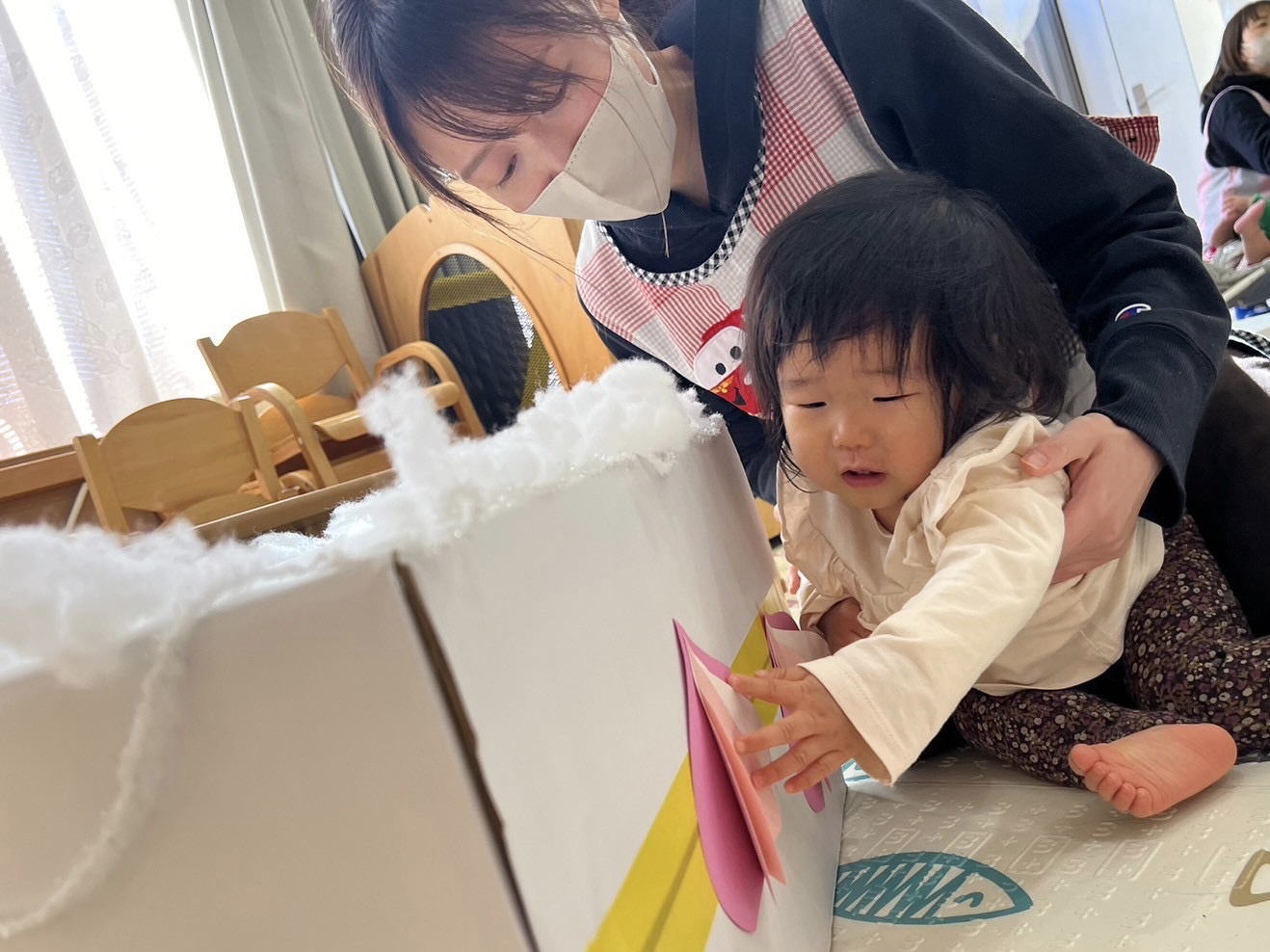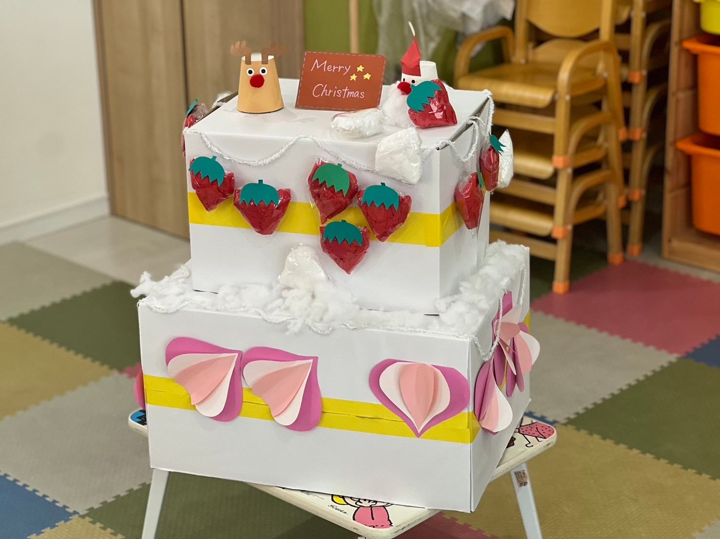いるか組とくじら組のお友だちは、クリスマスケーキの上の段に、くじ箱から引いたイチゴ、生クリームを貼って、飾り付けしました。