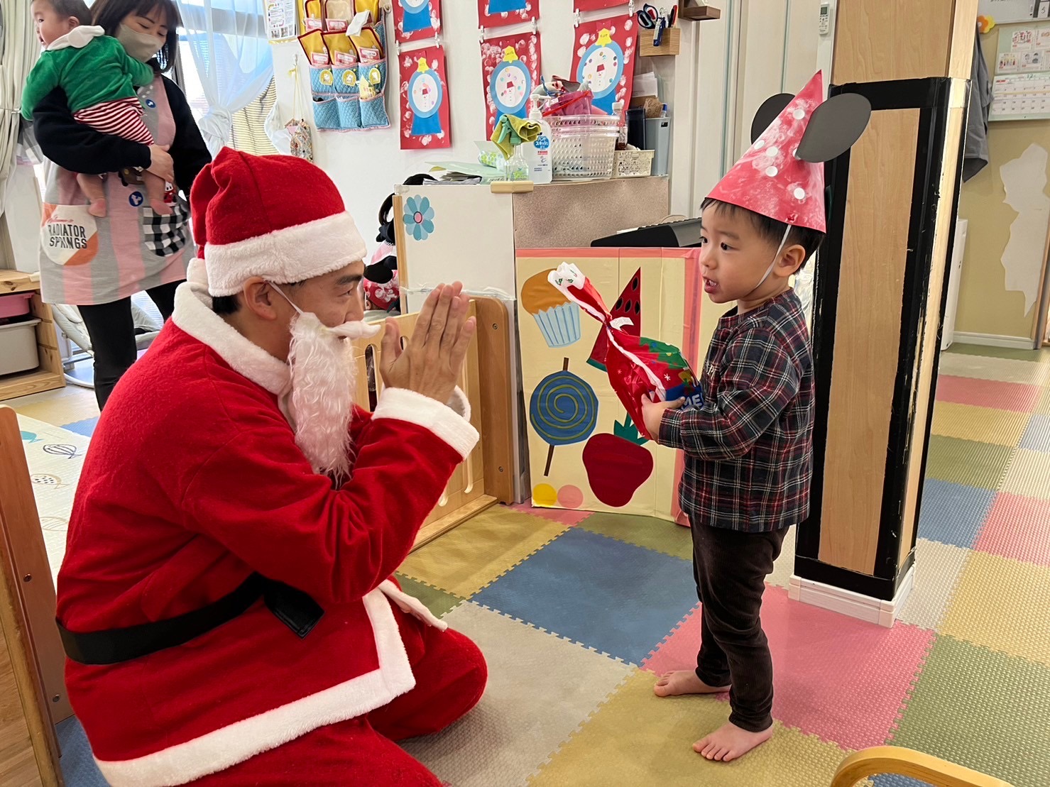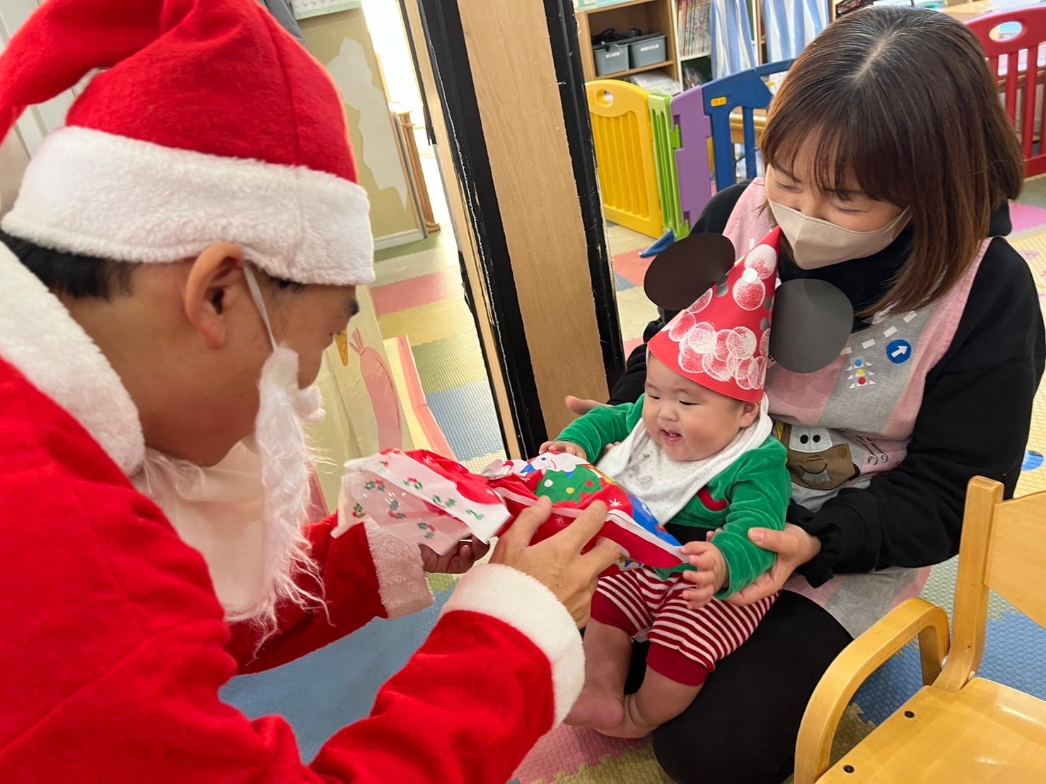 サンタさんの登場に、驚きの表情を見せる子どもたちでしたが、サンタさんからプレゼントをもらうと、嬉しそうな顔を見せたり、「ありがとう」とお礼を伝えることができました😊