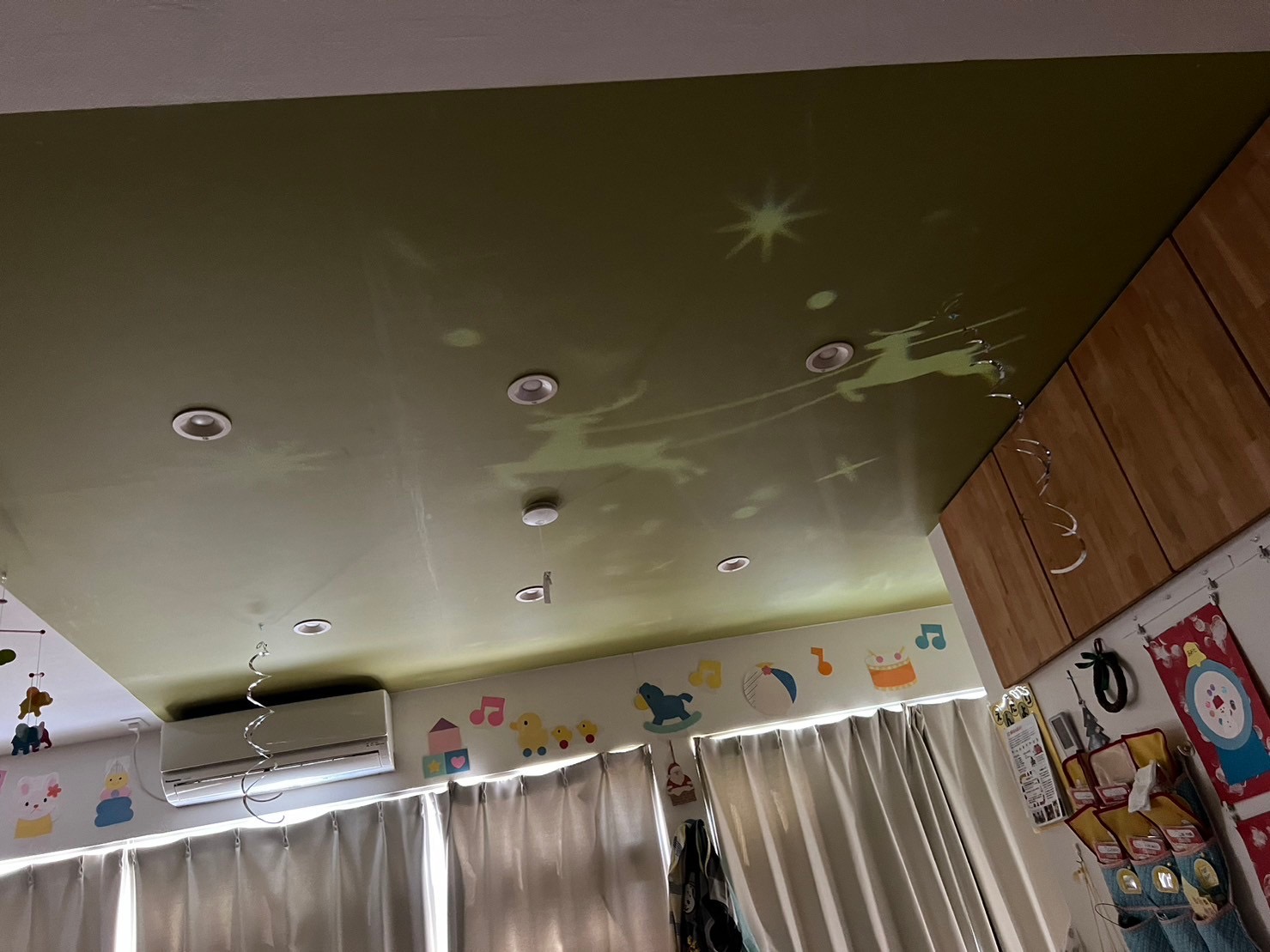 次のお友だちの所へプレゼントを届けるためにサンタさんが帰ってしまうと、今度はらっこ組の天井に、トナカイを連れてソリに乗って飛んでいるサンタさんを見つけました👀✨