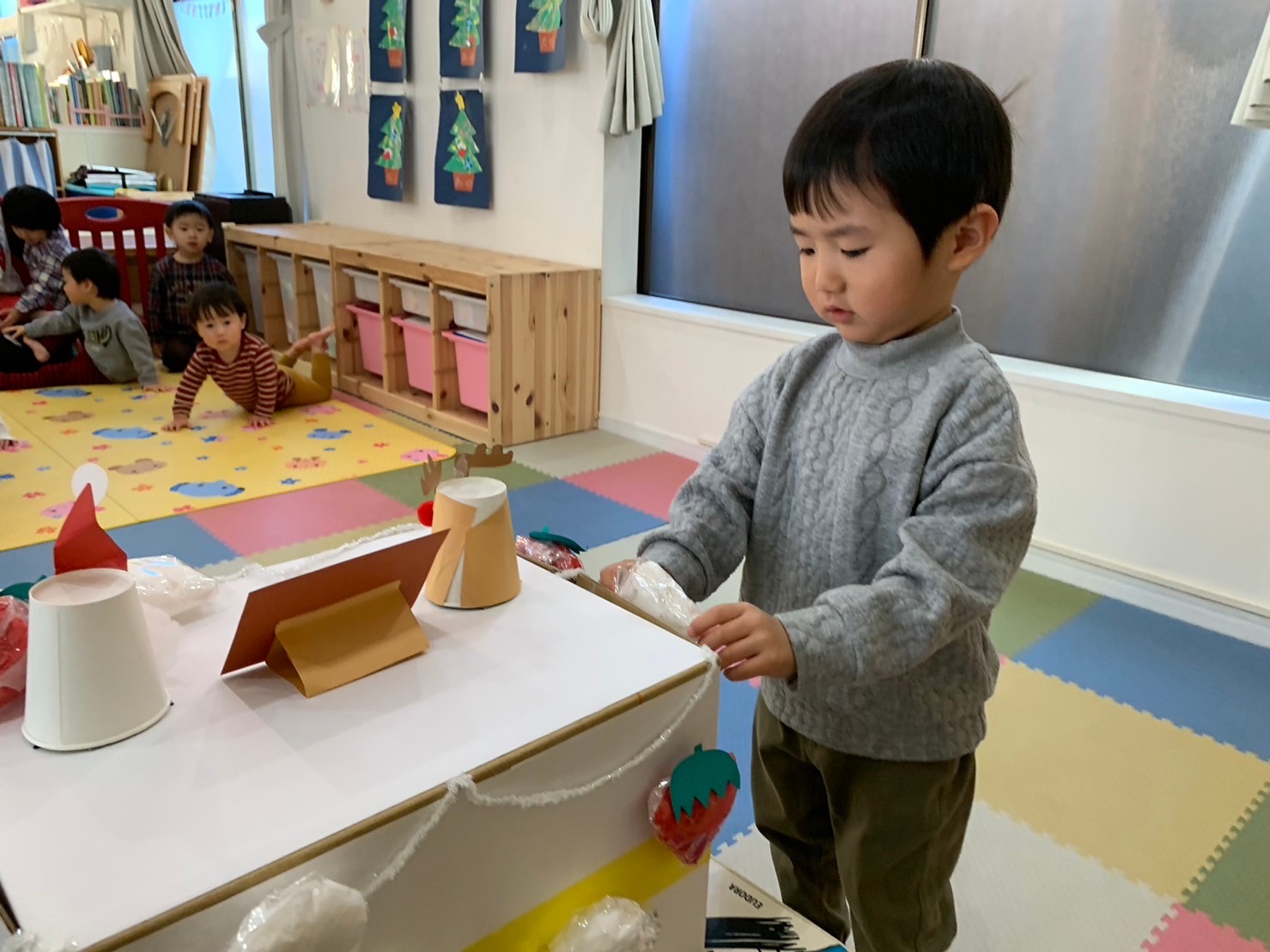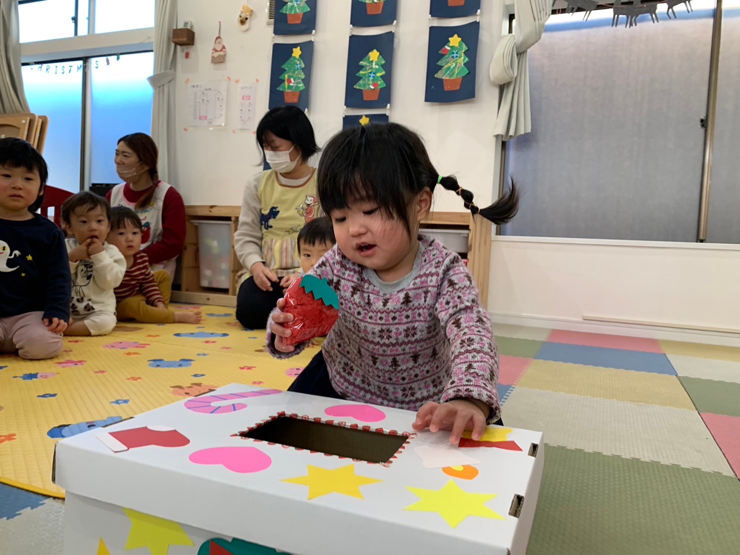 当日まで、お部屋のサンタさんやトナカイの装飾に興味を持って見たり、朝の会ではクリスマスの歌を元気良く歌ったりしながら、クリスマス会に期待を持っていた子どもたち❣️