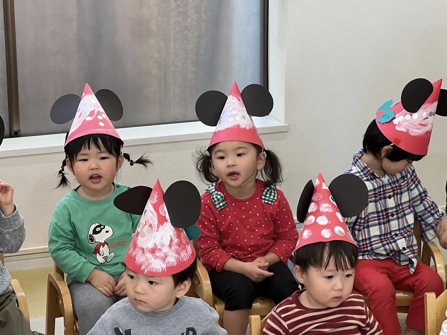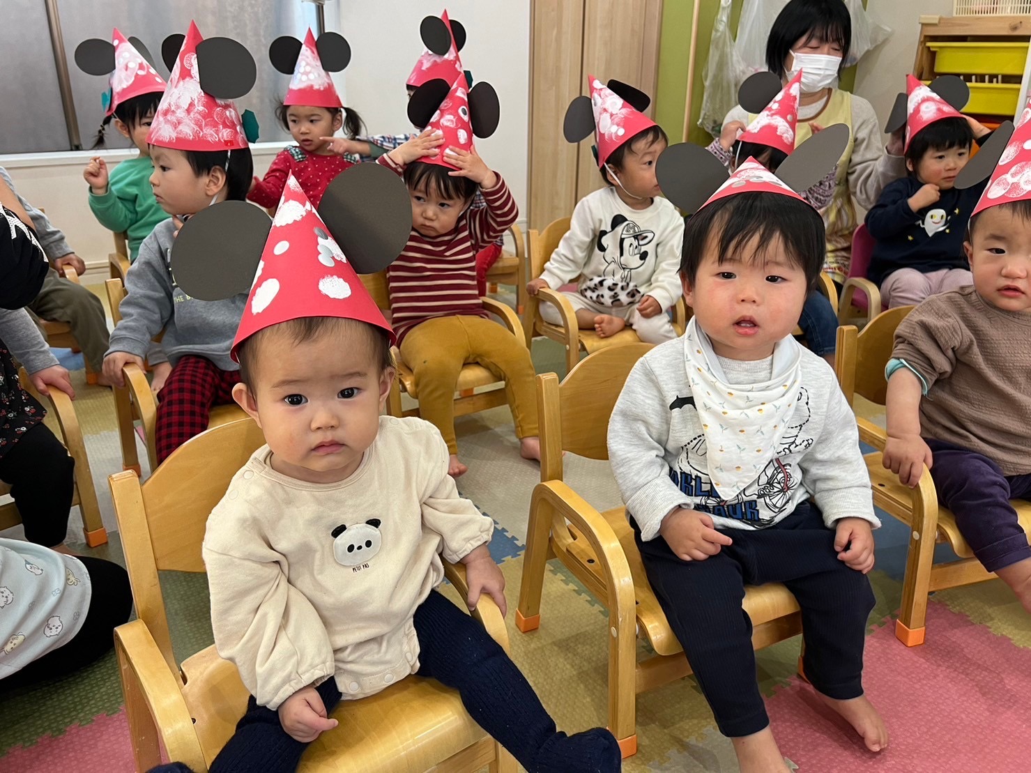 今度は、椅子に座って、以前に制作したサンタミッキーの可愛い帽子をかぶり、みんなで「あかはなのトナカイ」「あわてんぼうのサンタクロース」を歌いました🎶