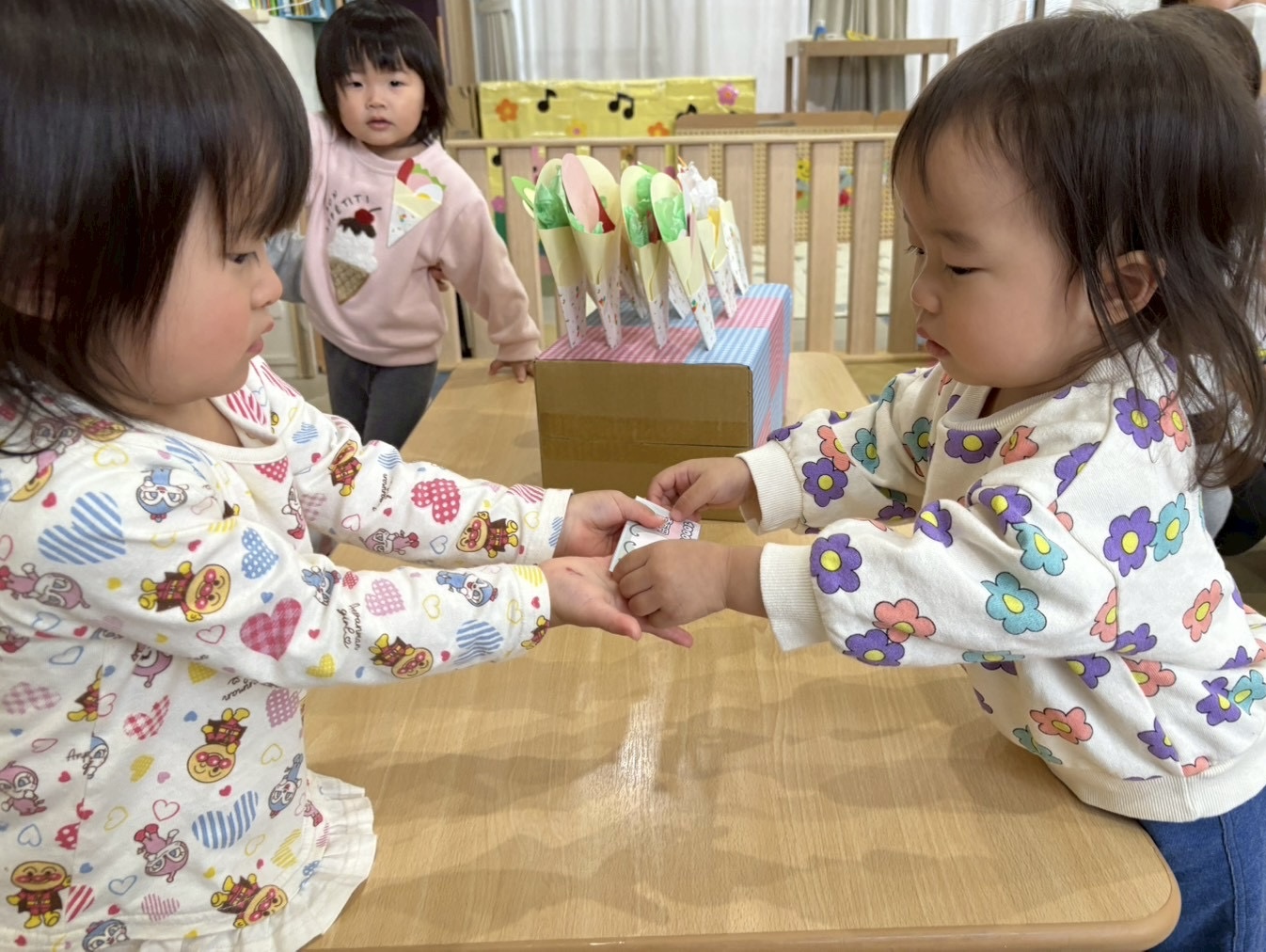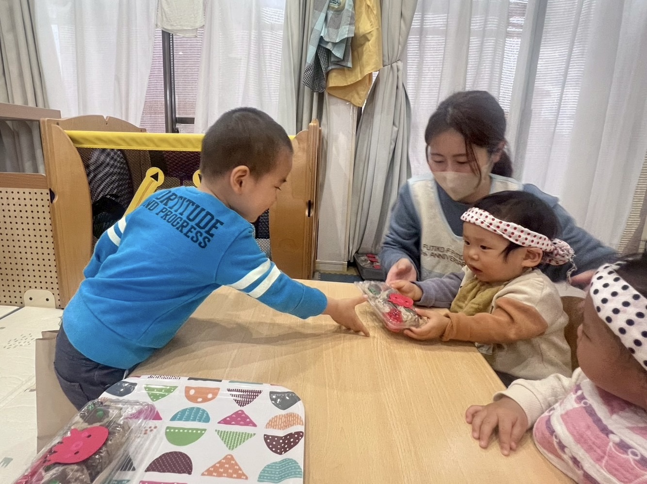 まだ1人でやりとりすることが難しい子どもたちも、保育者と一緒にやりとりを楽しみましたよ😌
