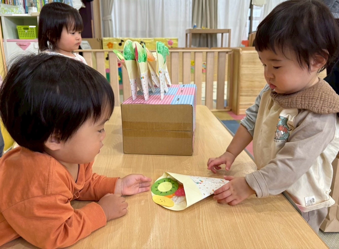 お店屋さんの子どもたちは、「はいどうぞ」と商品を渡し、お客さんは嬉しそうにカバンへ入れていましたよ🌟