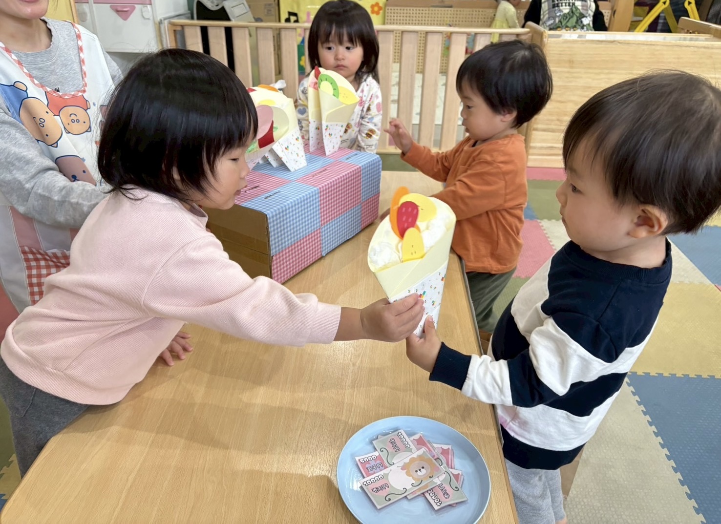 異年齢のお友だちとたくさん関わり、お店屋さんごっこならではの、「これください」「どうぞ」の商品の受け渡しのやりとりを楽しみました🎵