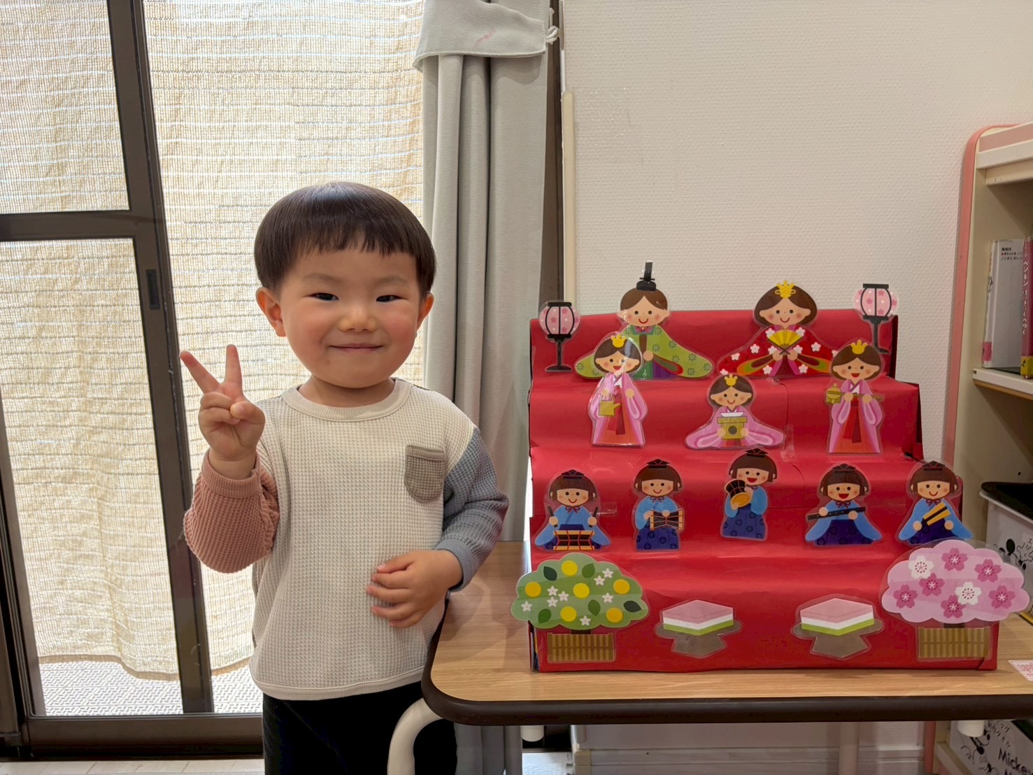 以前からひな祭りの歌を歌ったり、室内のひな祭りの飾りを見ているため、「今日は何の日かな?」と保育者に尋ねられると「ひな祭り!」と元気に答えてくれた子どもたち☺️