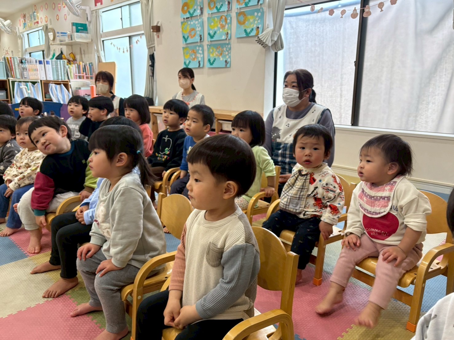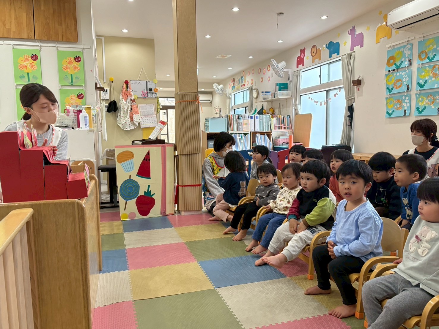 物語の中に出てくる動物や食べ物に反応したり、真剣にお話を聞いていました。